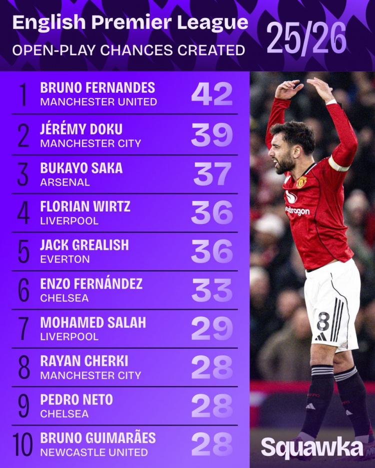 mk体育官网-本赛季英超运动战创造机会次数:B费42次第一,多库萨卡二三位